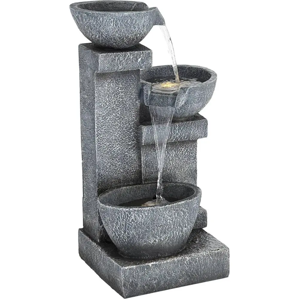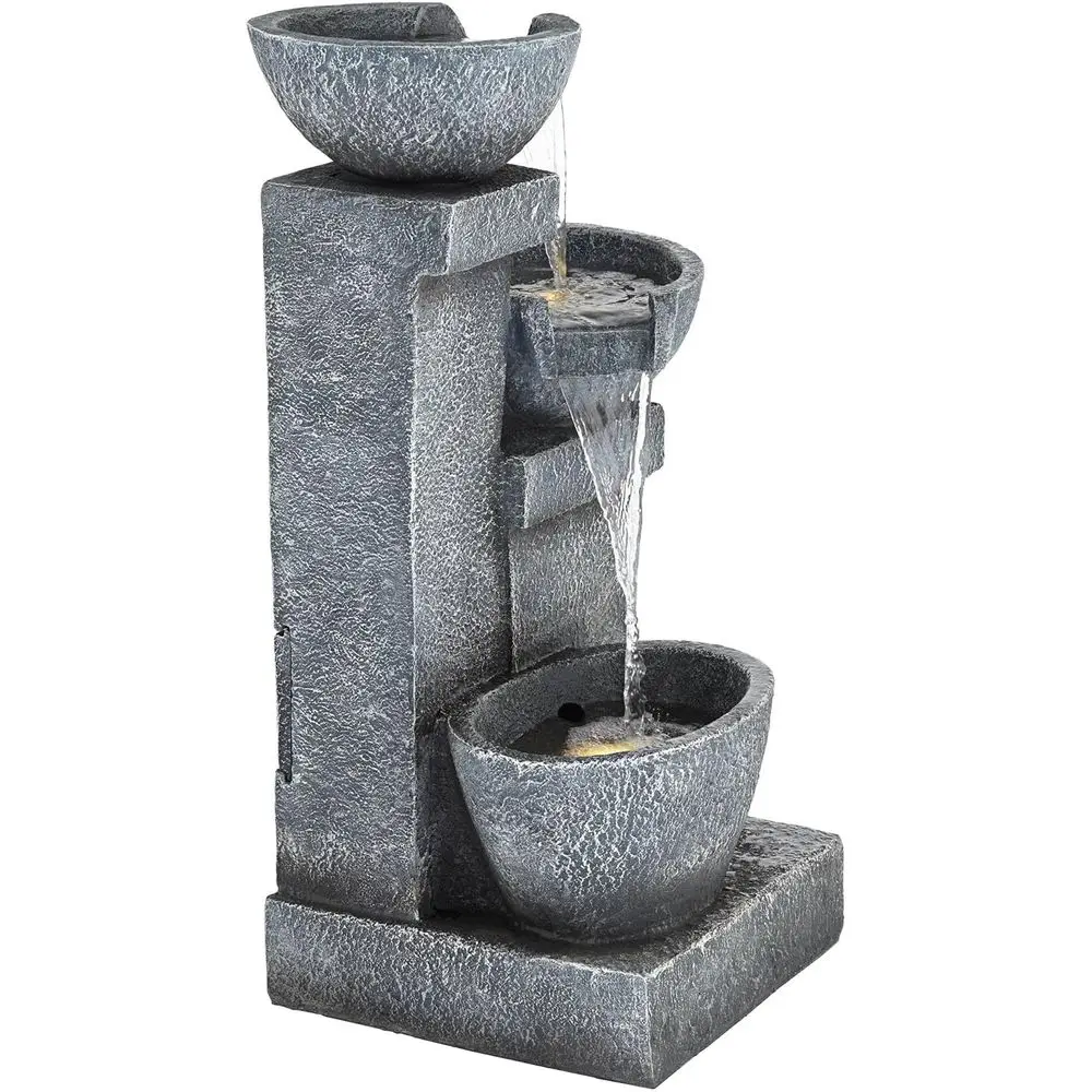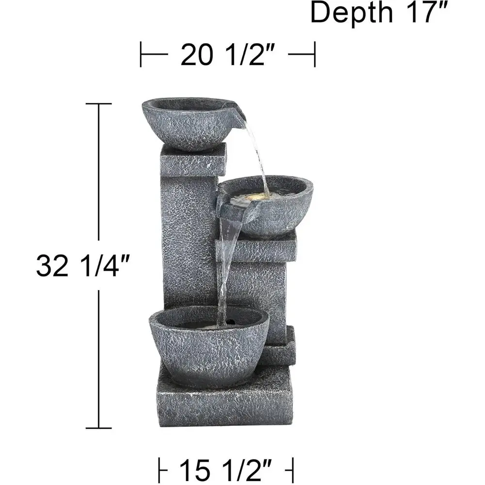This is a three-tiered cascading floor fountain with an LED light feature. Suitable for both indoor and outdoor use, it adds a touch of elegance to any patio or garden setting. The fountain has a gray, stone-like finish and is made from lightweight resin, making it easy to move and install. It comes with a water pump and a 6-foot power cord for simple setup. The dimensions of the fountain are 32.25 inches in height, 20.5 inches in width, and 17 inches in depth, with a water capacity of 4 gallons. The opening on the back measures 6 inches in height by 5 inches in width, and the base is 15.5 inches wide by 4 inches thick. The fountain weighs 35.2 pounds and is powered by electricity, requiring a plug-in connection.