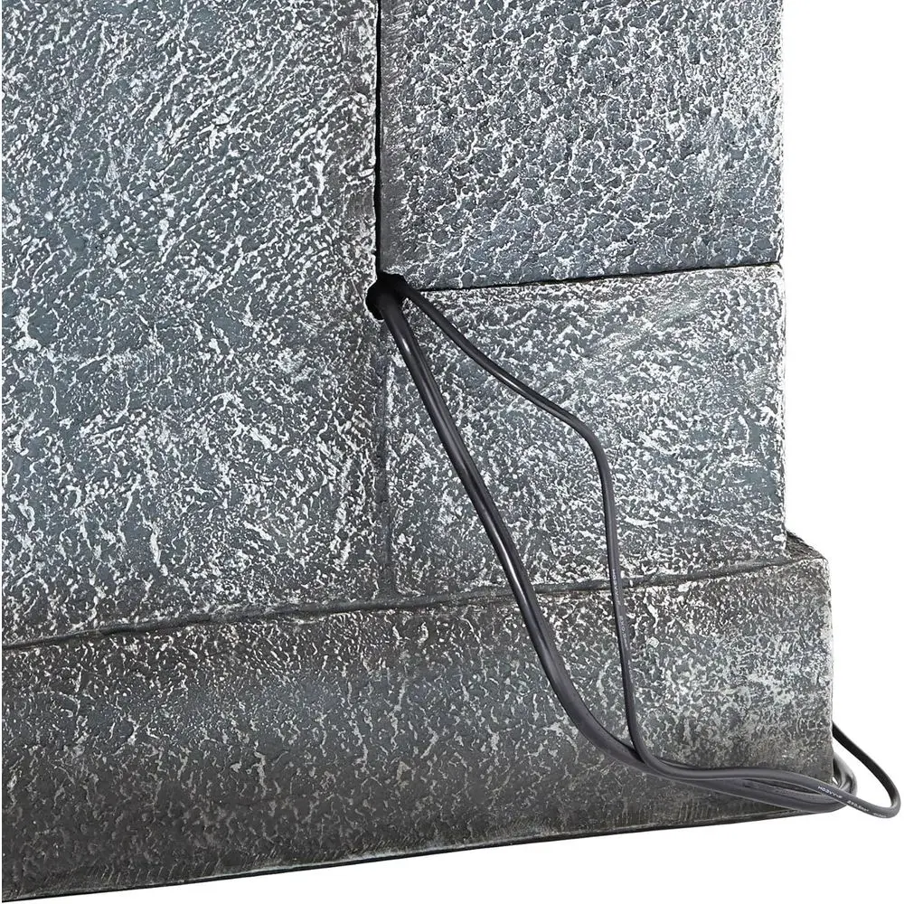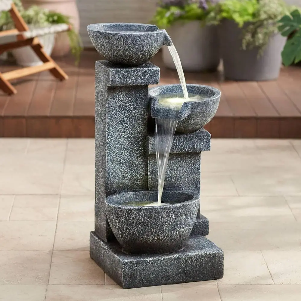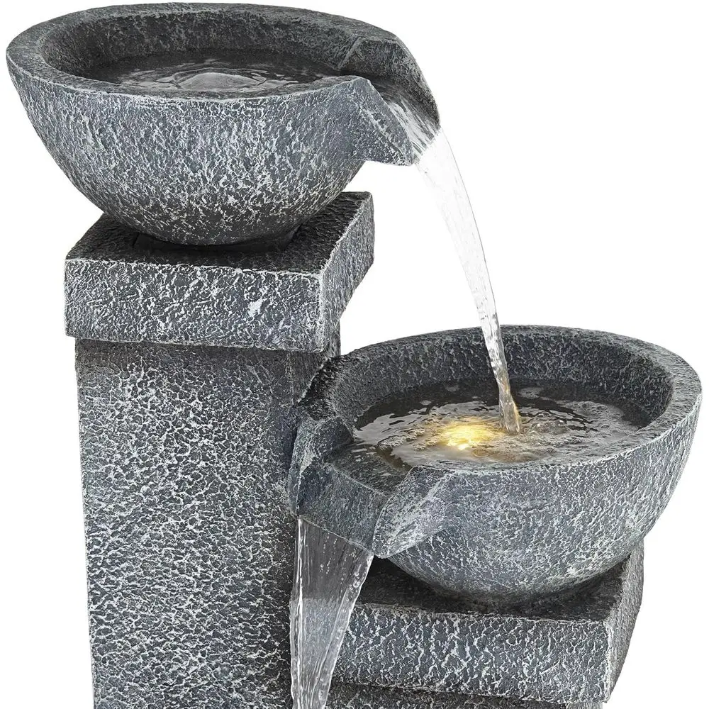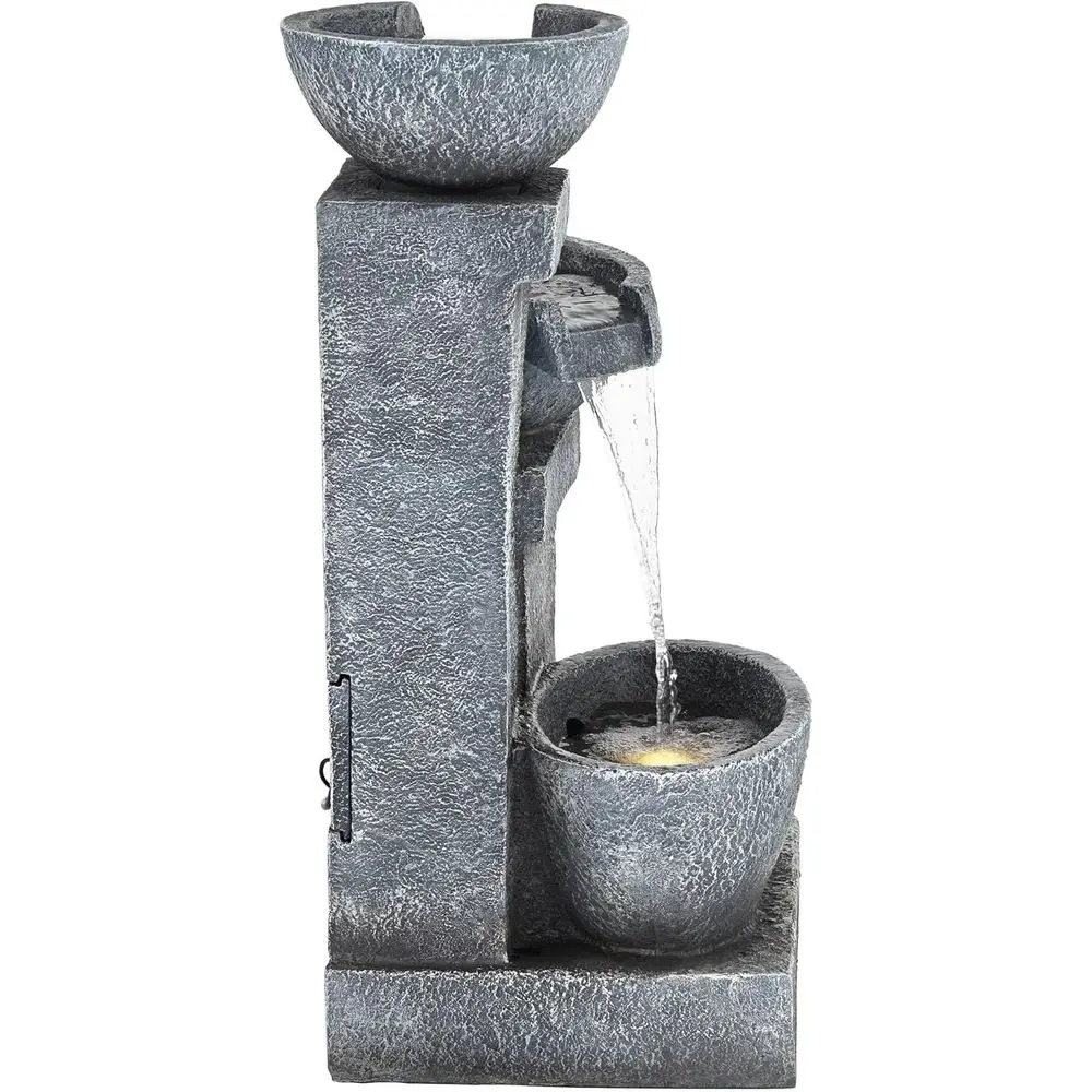 This is a three-tiered cascading floor fountain with an LED light feature. Suitable for both indoor and outdoor use, it adds a touch of elegance to any patio or garden setting. The fountain has a gray, stone-like finish and is made from lightweight resin, making it easy to move and install. It comes with a water pump and a 6-foot power cord for simple setup. The dimensions of the fountain are 32.25 inches in height, 20.5 inches in width, and 17 inches in depth, with a water capacity of 4 gallons. The opening on the back measures 6 inches in height by 5 inches in width, and the base is 15.5 inches wide by 4 inches thick. The fountain weighs 35.2 pounds and is powered by electricity, requiring a plug-in connection.