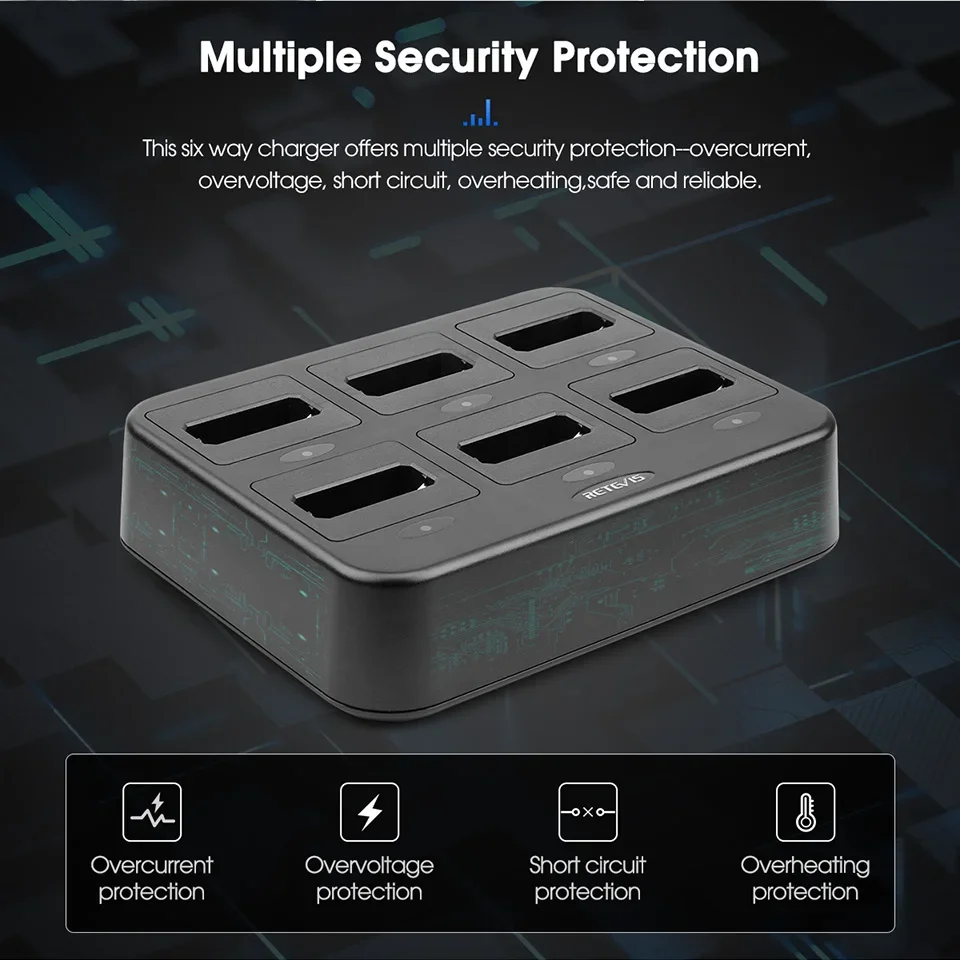 This six way charger offers multiple security protection–overcurrent, overvoltage, short circuit, overheating,safe and reliable.